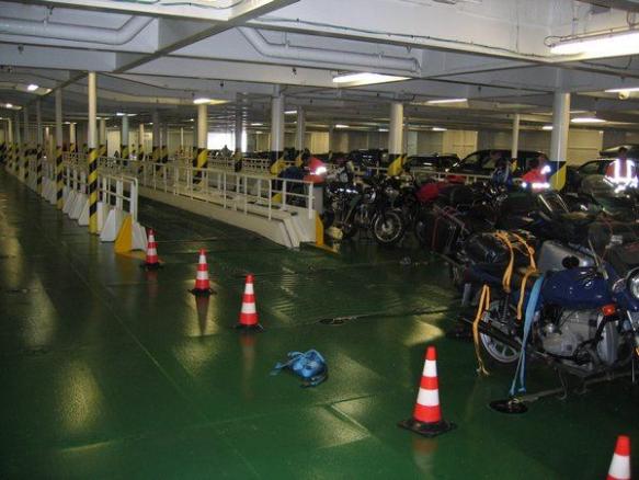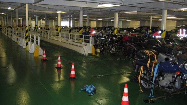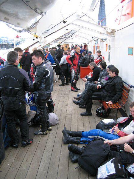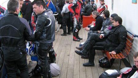 Waren mit der Pride of Rotterdam schon einige Motorradfahrer unterwegs, so war die Fähre Lady of Mann der Steam Packet Company von Heysham nach Douglas mit Motorradfahrern total überfüllt, als diese gegen 15:00 ablegte. Mangels ausreichender Sitzplätze verbrachten viele Reisende, wie wir leider auch, die 3.5 stündige Überfahrt auf dem Deck sitzend oder liegend. Gott sei Dank war es inzwischen ein richtig schöner sonniger Tag geworden. Spätestens jetzt wurde sichtbar warum es sich empfiehlt rechtzeitig, was heißt mindestens ein halbes Jahr vor Reiseantritt, zu buchen. Die Motorräder wurden zum Teil in dreier Reihen nur mit Stricken gesichert. Es war so eng daß man nur mit Mühe zu seinem Motorrad kam. Als Andenken hat jetzt die Verkleidung meiner XJ-900S eine Schramme.