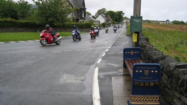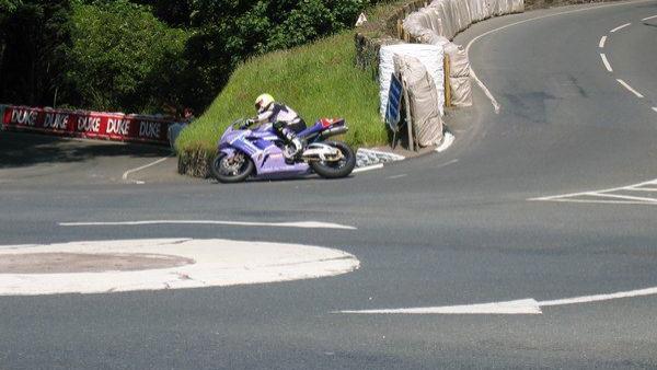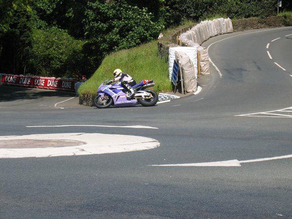 Auf der Fähre kann man auch das Official Programme der TT kaufen, um sich über die TT vorab zu informieren. Was es bedeuted, während der Renn-/Trainingszeiten auf der IoM unterwegs zu sein, erfuhren wir dann auch bei unserer Ankunft in Douglas. Da gerade auf dem Rennkurs trainiert wurde und unser Campingplatz Cronk Dhoo direkt an der Rennstrecke bei Greeba lag, mußten wir warten bis das Training vorbei war. So hieß es bereits am ersten Abend erst einmal Rennatmosphäre zu schnuppern, was wir bei Quarterbridge , einer 90 Rechtskurve in Douglas taten. Dieser Punkt ist sehr beliebt wegen der Nähe zum Stadtzentrum und wohl auch wegen des Pub"s. Hier gönnten wir uns dann auch erst einmal einen großen ausgezeichnet schmeckenden CheeseBurger zum Abendbrot.
