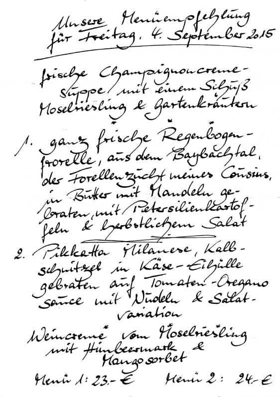 Bernd hatte die letzten beiden Stellen der Postleitzahl vertauscht, anstatt 56814 stand 56841 auf dem Zettel und das hatte Jürgen in sein Navi eingegeben. Nun mussten wir noch etwas länger auf unser Abendessen warten...