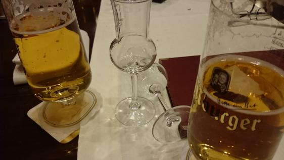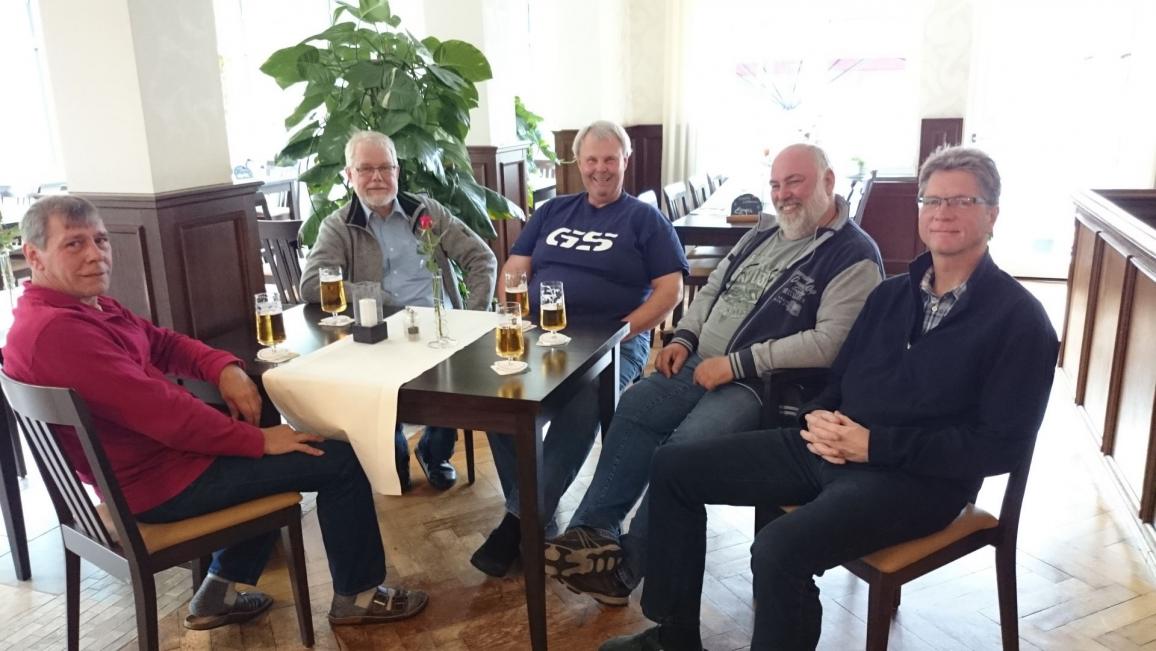 Wir bekamen einen schönen runden Tisch in ausreichender Größe zugewiesen. Dieser war liebevoll und ansprechend eingedeckt. Currywurst Pommes gab s heute nicht, das war uns schon klar doch was durften wir erwarten. Die beiden Bernds dachten sicherlich schon wieder darüber nach ob in solchem Ambiente ein sättigendes Essen möglich sei. Ich hatte einfach nur Hunger und Durst. |