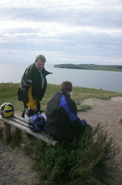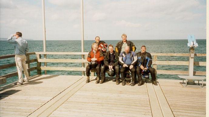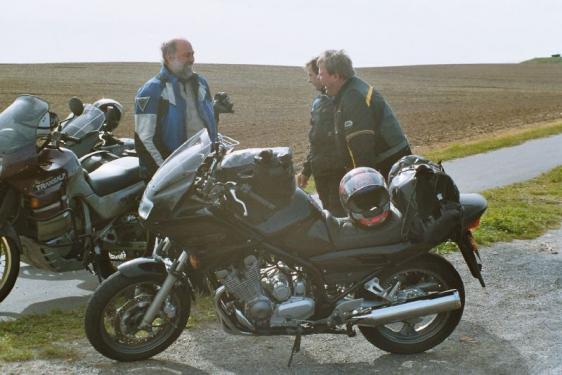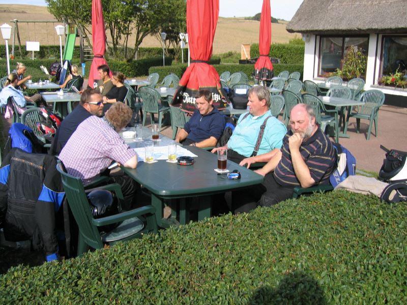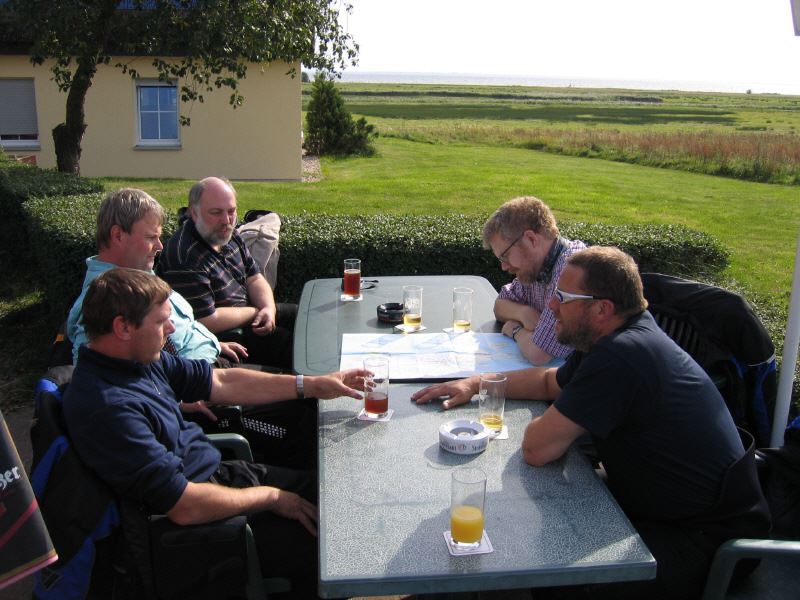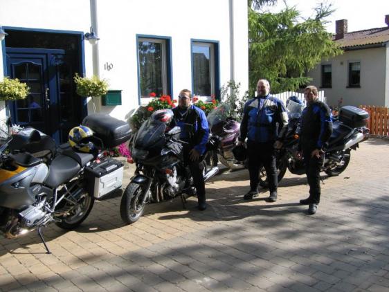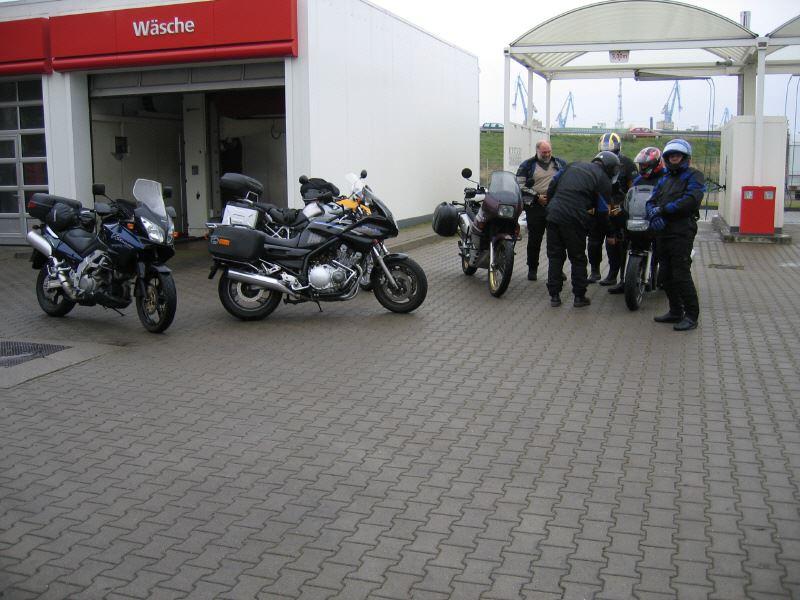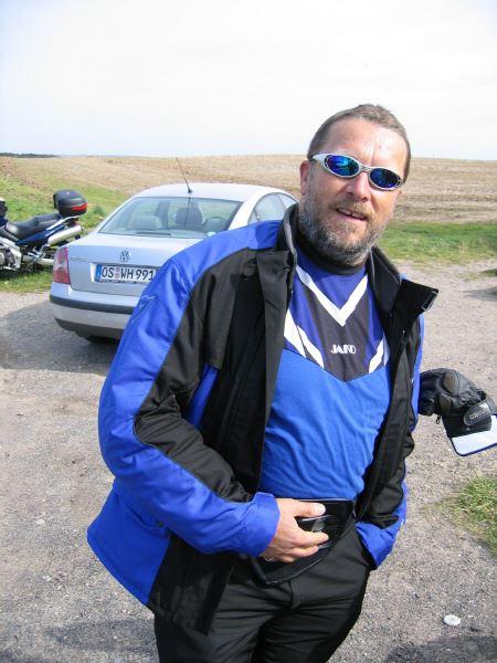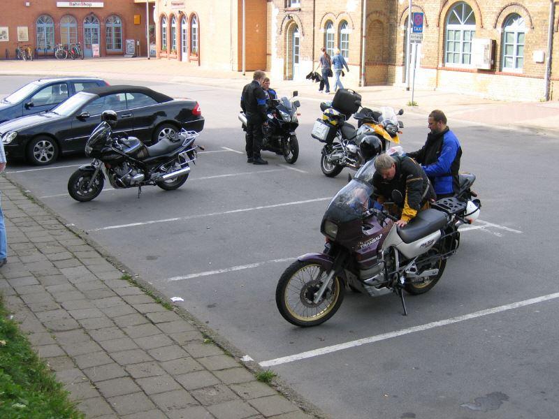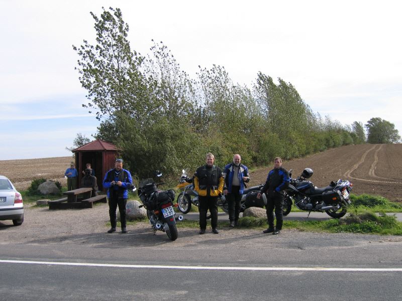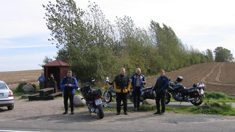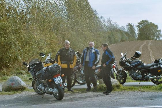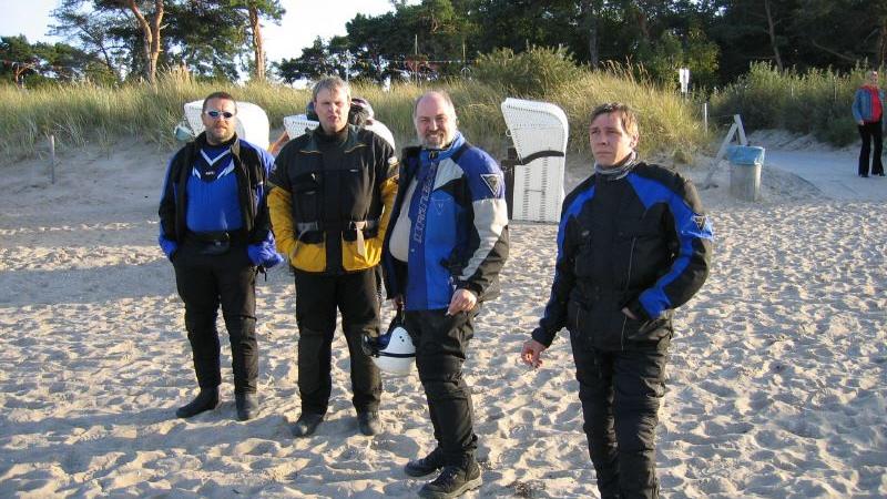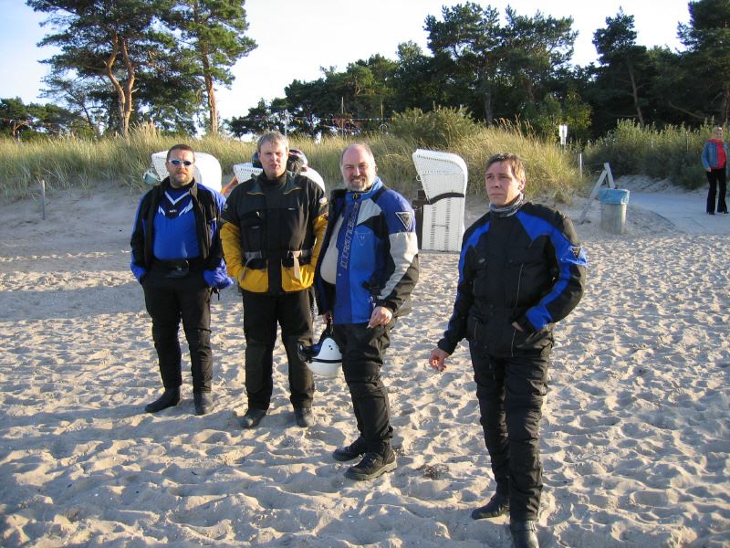 A N R E I S E T A G Wider Erwarten pünktlich trafen alle Biker um 9 Uhr in Horneburg ein. Es war herrliches Wetter, die Sonne schien und keine Regenwolke trübte den Himmel. Nach der Begrüßung und einer Zigarettenpause machten wir uns auf den Weg Richtung Osten. Bernd E., wie immer unser Scout, fuhr an erster Stelle. Norbert hatte sich gewünscht, hinter mir zu fahren. Also nahm ich die zweite Position ein, gefolgt von Norbert auf seiner Trans Alp. Auf Position Vier machte sich Volker auf den Weg. Das Schlusslicht bildete wie immer Willi, mit seiner V-Strom. Die erste und die letzte Position sind eigentlich immer gesetzt, egal wo unsere Ausfahrten auch immer hin gehen. Langsam fuhren wir durch Horneburg. So eine Motorradkolonne sieht man nicht alle Tage bei uns im Ort. Deshalb drehte sich der Eine und Andere zu uns um. Wir bogen kurz auf die B73 ab (Deutschlands unfallträchtigste Bundesstraße), um sie gleich darauf wieder zu verlassen. Wir ließen die Ortschaften Nottensdorf, Grundoldendorf, Apensen, Nindorf, Goldbeck, Rahmstorf und Moisburg hinter uns. Über Grauen und Eversen fuhren wir in den Rosengarten Richtung Hittfeld. Diese Straße geht durch ein schönes Waldgebiet. Von vielen Hamburgern wird es als Naherholungsgebiet genutzt. Hier duftete es herrlich nach Tannenwald und harzigen Tannenzapfen. Zügig ging es voran und bald war Hittfeld erreicht. Von hier führte uns Scout Bernd E. über Maschen zur Autobahn Richtung Lüneburg. Es herrschte wenig Verkehr. So kamen wir ohne Probleme nach Lüneburg. Von dort aus fuhren wir weiter durch Adendorf nach Lauenburg, wo wir die Elbe überquerten. Zwischendurch roch es immer wieder nach der Kartoffelernte. Diesen Duft verliert man nie mehr aus dem Gedächtnis, wenn er einmal aufgenommen ist. Bei diesem Duft kamen mir immer wieder einige Kindheitserinnerungen in den Sinn. Die Fahrt ging weiter über Büchen und Ratzeburg nach Ziethen. Dort angekommen, wurde in der Bäckerei von Allwöhrden eine Frühstückspause eingelegt. Nach dem Genuss von frischen belegten Brötchen und leckerem Kaffee, setzten wir die Reise fort. Kurz vor der Autobahn legten wir noch einen Tankstop in Schönberg ein. Bevor wir die Reise fortsetzten, entfernte ich noch einmal die vielen toten Insekten vom Helmvisier, die dort ihr Leben gelassen hatten. Auf der Autobahn fuhren wir bis zum Abzweig Wismar. Dann ging es am Salzhaff vorbei nach Rerik. Oberhalb des Salzhaffs legten wir noch einen Zwischenstop ein.