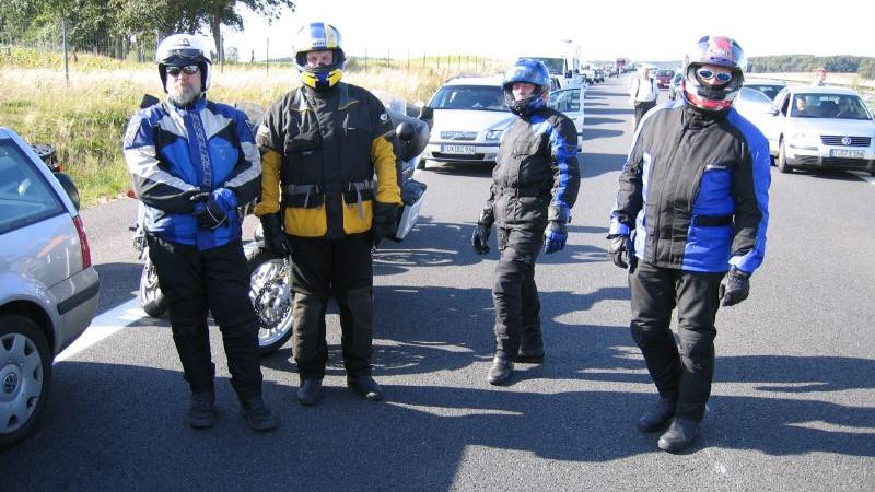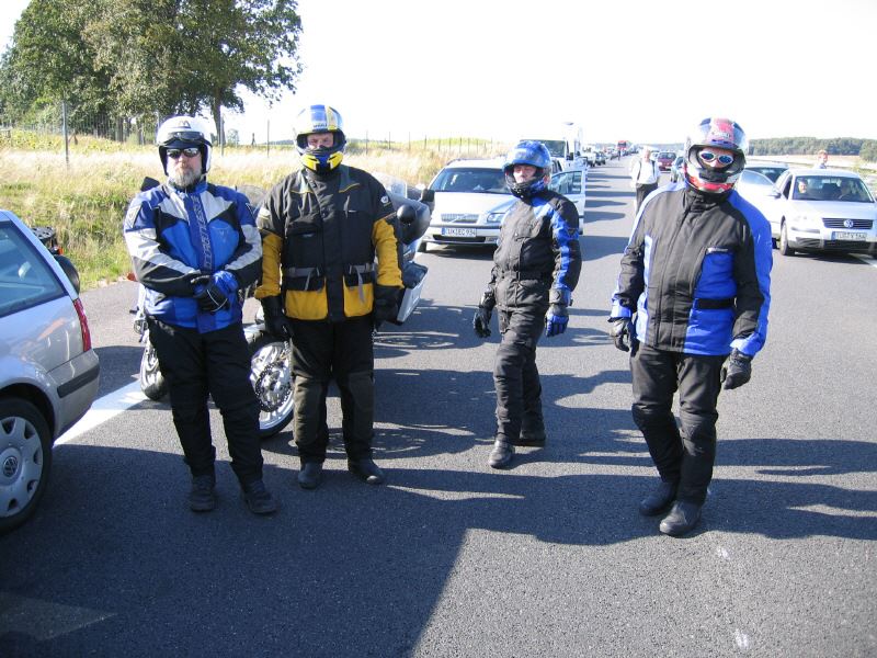 Das Mittagessen sollte in Rerik im Restaurant "Steilküste" stattfinden, wie bei unserem letzten Rügentrip. Doch gerade als wir ankamen, wurde das Restaurant geschlossen. Also hatten wir diesmal kein Glück. Ohne Pause setzten wir unsere Fahrt über Heiligendamm und Bad Doberan fort. Nun befanden wir uns auf der Ostseeautobahn. Nach wenigen Kilometern kamen wir in einen Stau. Die Autofahrer hatten eine breite Rettungsgasse gebildet. Wir nutzten diese Gasse aus und fuhren langsam zwischen den stehenden Autos bis an den Stauanfang.