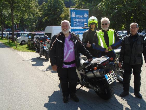 Nächster Höhepunkt, Schloss Neuschwanstein. Wir hatten nicht den Ehrgeiz das Schloss zu besichtigen, einige von uns hatten das schon vor Jahren erledigt. Doch Bernd reizte es, so dicht wie nur irgend möglich an das Schloss heranzufahren. Muss doch irgendwie möglich sein, ist es nicht, haben wir gelernt. Als suchten wir uns, Slalom durch die Asiatinnen fahrend, einen Stellplatz für die Mopeds, um nur mal schnell das obligatorische Foto zu schießen. Geklappt, und weiter. |