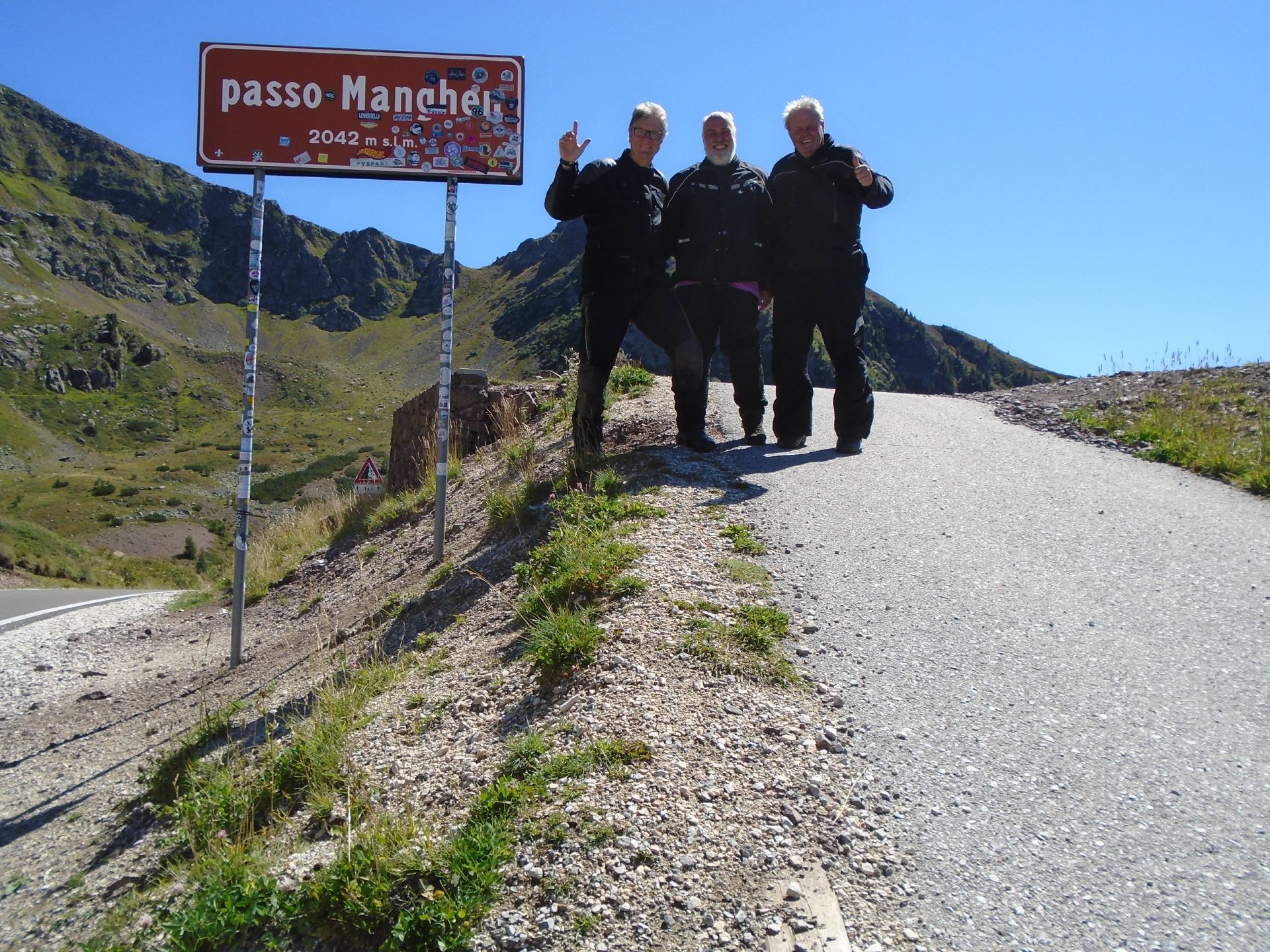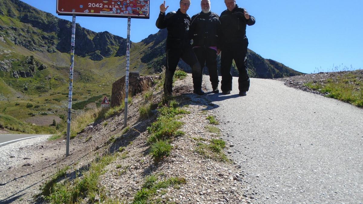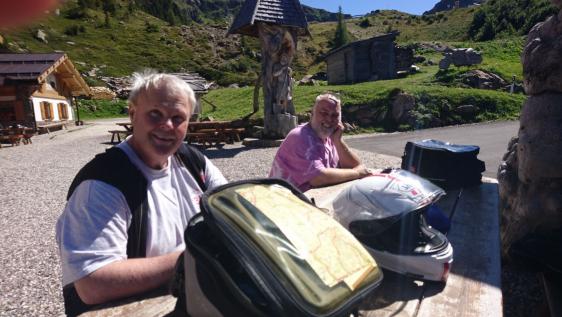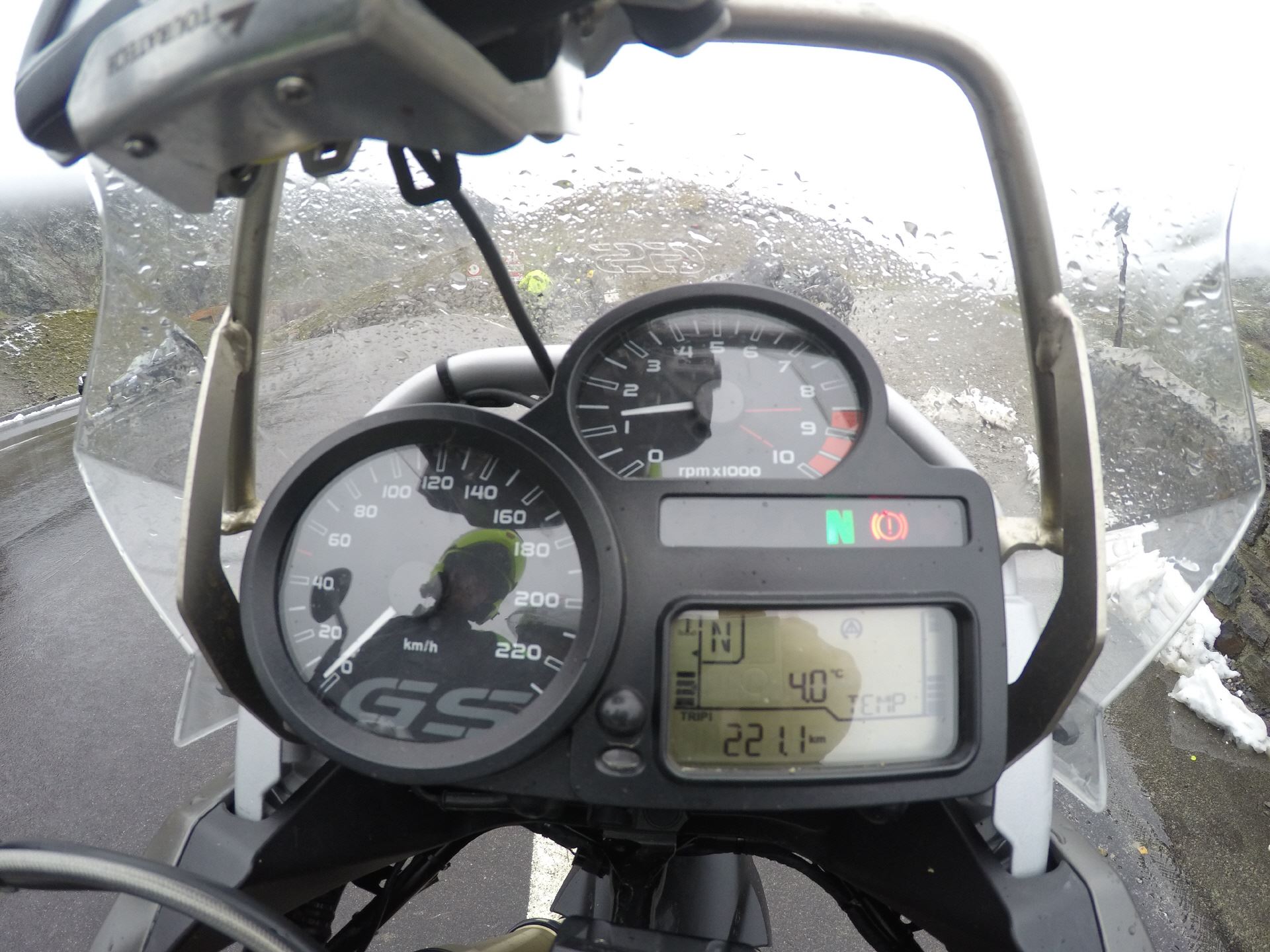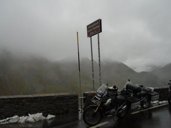 So frisch gestärkt fuhren wir nun zurück zur SS44 und dann hoch zum Timmelsjoch eingehüllt von Nebel, unterhalb der Regenwolken die unablässig ihre kalte Fracht auf uns entluden. Kurz vor dem Tunnel durchstießen wir die Wolkendecke, die uns als Nebel begleitete, die Regenwolken jedoch nicht. Hinter dem Tunnel lagen links und rechts der Fahrspur noch Schneereste. Auf dem Pass legten wir eine kurze Pause für ein paar Fotos ein. Bei vier Grad und Regen war das nicht gerade lauschig aber irgendwie lustig. Denn Humor ist, wenn man trotzdem lacht. |