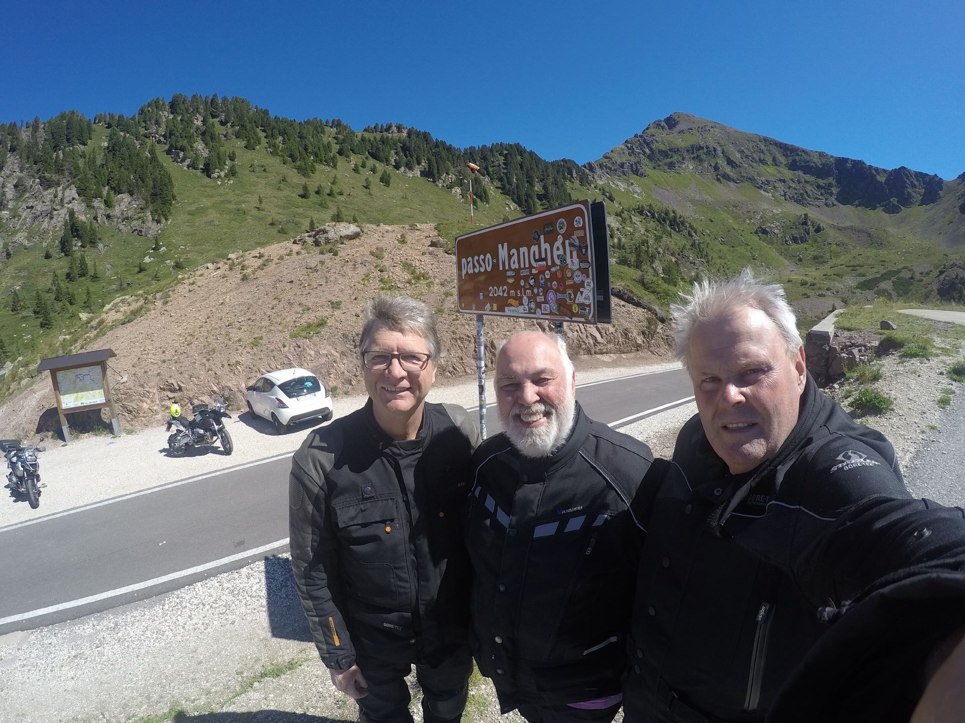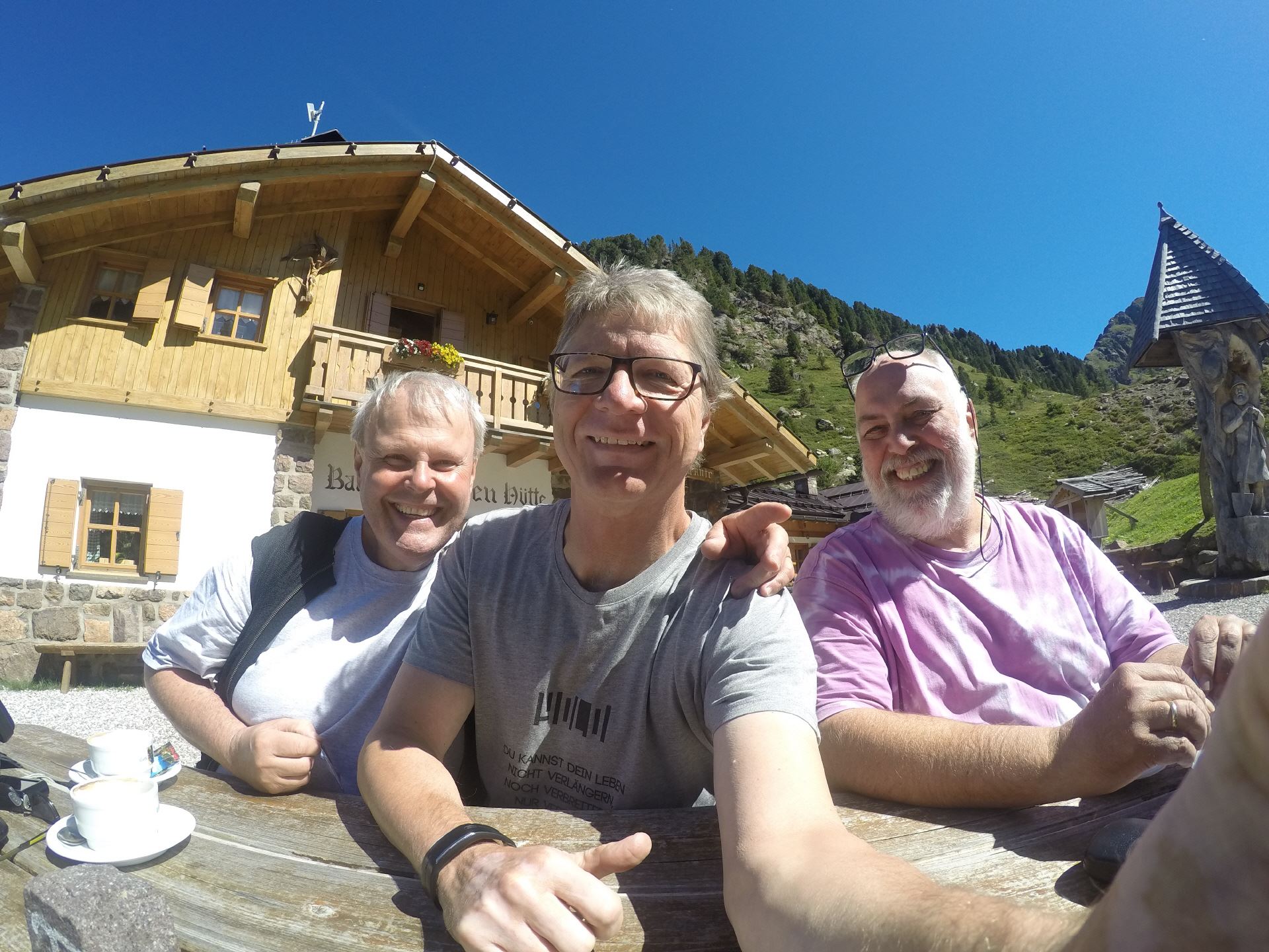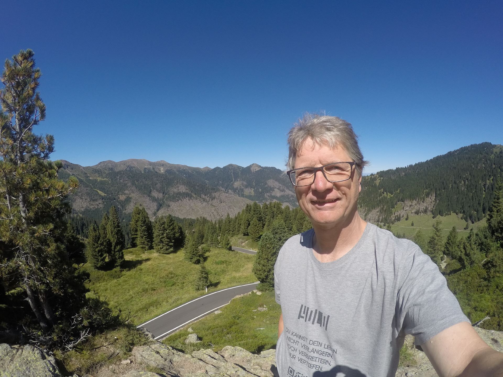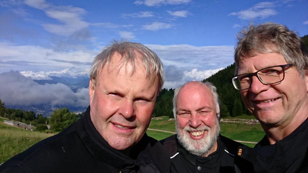 So frisch gestärkt fuhren wir nun zurück zur SS44 und dann hoch zum Timmelsjoch eingehüllt von Nebel, unterhalb der Regenwolken die unablässig ihre kalte Fracht auf uns entluden. Kurz vor dem Tunnel durchstießen wir die Wolkendecke, die uns als Nebel begleitete, die Regenwolken jedoch nicht. Hinter dem Tunnel lagen links und rechts der Fahrspur noch Schneereste. Auf dem Pass legten wir eine kurze Pause für ein paar Fotos ein. Bei vier Grad und Regen war das nicht gerade lauschig aber irgendwie lustig. Denn Humor ist, wenn man trotzdem lacht. |
