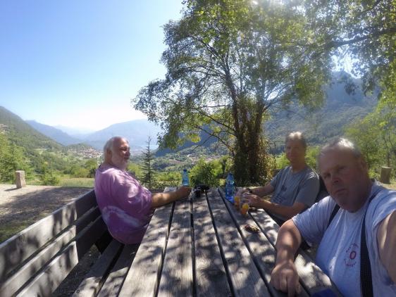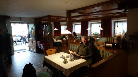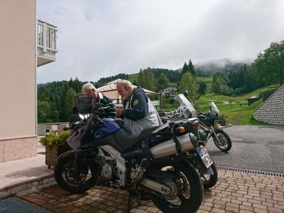 Zu der ausgearbeiteten Tour gehörte auch ein Teilstück, das Parallel zur SS44 kurvenreich über Schenna führte. Irgendwann standen wir vor einem Durchfahrtsverboten Schild, die Hauptstraße führte nach rechts, das war eindeutig die falsche Himmelsrichtung. Wir hatten durch Hunger und Kälte irgendwie einen Zustand erreicht, der uns in unseren Entscheidungen stark einschränkte. Anstatt dem Navi weiter zu folgen sind wir umgekehrt. In der nächsten Gaststätte kehrten wir ein. So ein Glück. Ich war schon weit weg von Wohlbefinden. Ich fror extrem, war nass bis auf die Haut und hungrig. Ich konnte mir nicht vorstellen, dass wir in das Lokal hereingelassen werden. Doch ohne Murren wurden wir empfangen und sehr gut bedient. Wir belegten zwei Tische, weil wir unsere nassen Sachen auf mehreren Stühlen verteilen mussten. Unter uns bildeten sich Pfützen und die Polster der von uns besetzten Stühle waren auf Stunden für normale Gäste nicht nutzbar. |