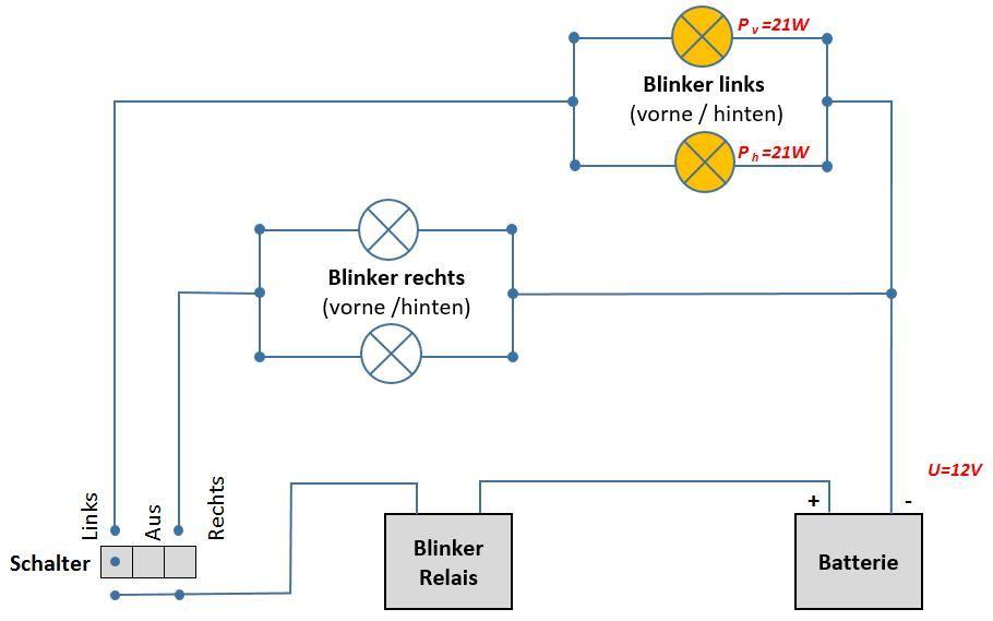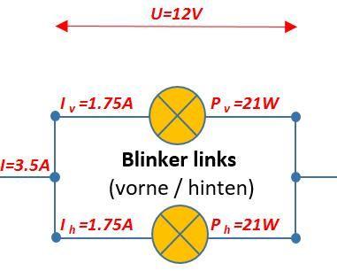 Da die Blinker vorne und hinten die gleiche Leistung haben, addieren sich die Teilströme (wie beim Fluß mit den Inseln) durch die Glühbirnen zum Gesamtstrom von I = 3.5A. |
