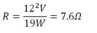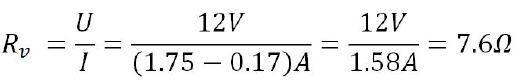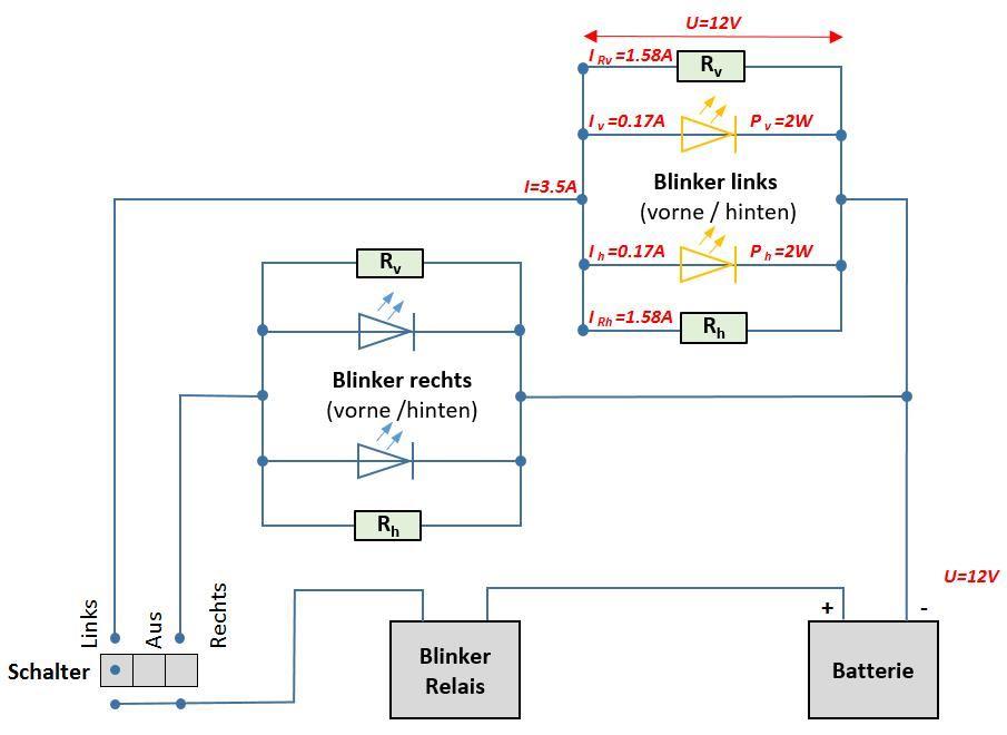 Das Blinker-Relais ist aber für eine höhere Gesamt-Leistung (P = 2 x 21W = 42W) und damit auch Strom (3.5A) ausgelegt. Die überschüssige Leistung pro mit LED ausgetauschter Glühbirne muß also abgeführt werden. Dafür schaltet man einen zusätzlichen Verbraucher in Form eines Widerstandes R parallel zur LED dazu. Dieser setzt elektrische Leistung in Wärme um. Der erforderliche Wert des Widerstandes Rv berechnet sich nach Gl. (1) aus der Spannung und der Differenz der Ströme von Glühbirne und LED |