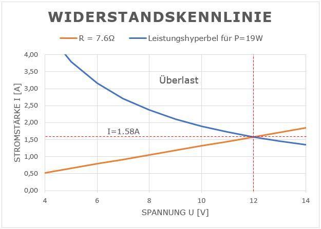 kann in das gleiche Diagramm die sogenannte Leistungshyperbel eingetragen werden. Der Schnittpunkt der Widerstandskennlinie mit der Leistungshyperbel markiert die Belastungsgrenze des Widerstandes. In unserem Fall U=12V und I=1.58A. Stromwerte unterhalb der Kurve sind im Dauerbetrieb zulässig, bei |