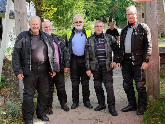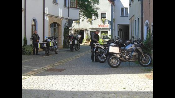 Nach 256 km haben wir unsere Motorräder wieder in der Tiefgarage abgestellt. Im Anschluss an die Wandlungsphase vom Biker zum Kneipenbesucher trafen wir uns im Restaurant des Hotels, probierten die Weißwürste und testen das Bier noch mal an. Volker hat nach einem alternativen Restaurant gesucht. Da dort auch das gleiche Bier ausgeschenkt wurde haben wir im Ratskeller einen Tisch reserviert. Bevor wir uns trafen hat jeder so seine Dinge erledigt. Ich war Frischgeld ziehen in der Bank und habe dort sehr nette Leute (Wohnmobilisten) kennengelernt. Auf dem Marktplatz, vor dem Hotel haben ich dann Willi und Bernd P. getroffen. |