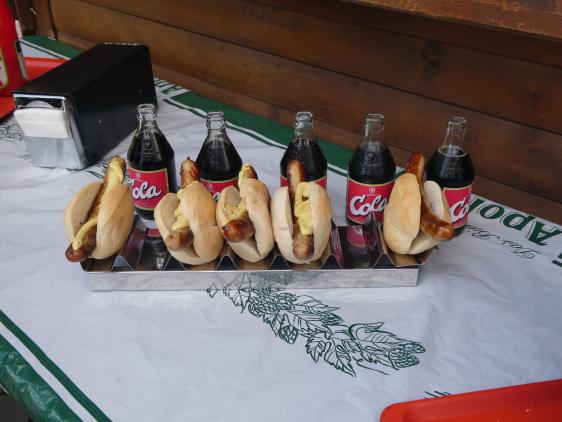 Dafür wurden am Hotel die Tische hergerichtet. Die Oldtimerfahrer trafen sich zum Imbiss am Hotel und wurden dort mit Würstchen und Getränken gestärkt. |