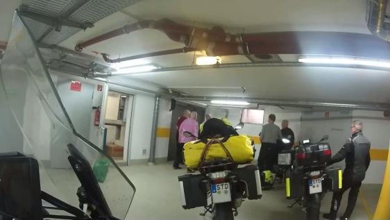 Wie gut das der Mann nicht klaustrophobisch war. Irgendwann halfen wir dann an der hydraulischen Pumpe mit und es gelang, den Gefangenen zu befreien. Der Wirt lud uns zu Freigetränken ein und so warteten wir auf den Techniker und vertrauten auf seine Fähigkeiten unsere Mopeds bald zu befreien. |