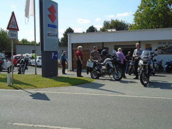 Also fuhren wir nach Schwarzenbach zu "Motorrad Guhs e.K." Nach ein wenig Wartezeit kam mein Moped auf die Bühne und erhielt die neuen Bremsklötze. Um die deutliche Ansage: "Die Scheiben müssen sehr bald neu" reicher und um 184 € ärmer verließen wir die Werkstatt. Herzlichen Dank für die schnelle Hilfe an einem Freitagnachmittag. |