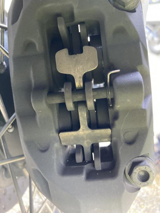 Auf einem Parkplatz in einem Wald wollten wir die Streckenführung neu überdenken, doch dann kam alles anders. Ich blickte zufällig und verträumt auf meine vorderen Bremssättel und fragte mich ob meine Beläge noch die richtige Stärke für unsere Tour aufweisen. Ich hatte das Gefühl, es könne eng werden. Eine Expertenmeinung schien mir angeraten. Ich bat meine Kumpels die Lage mal einzuschätzen. Bernd E. kommentierte: "Die halten keine 1000 km mehr!" Das klang besorgniserregend, denn wir hatten in den nächsten Tagen noch mindestens 2000 km geplant und es war Freitag um die Mittagszeit. |