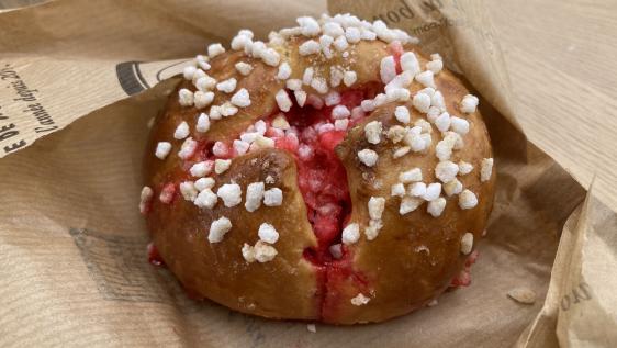 In Prades überfiel mich der "Kleine Hunger". Zu meinem Glück fand ich dort direkt an meiner Strecke die "Marie Blachère Boulangerie Sandwicherie Tarterie". Eine riesige Auswahl an frisch bereiteten Speisen, ich konnte mich kaum entscheiden. Neben einem perfekten Baguette kaufte ich mir noch dieses sündhaft süße Teilchen. Ich glaube es heißt "Brioches aux Pralines" und empfehle dringend es mal zu probieren.