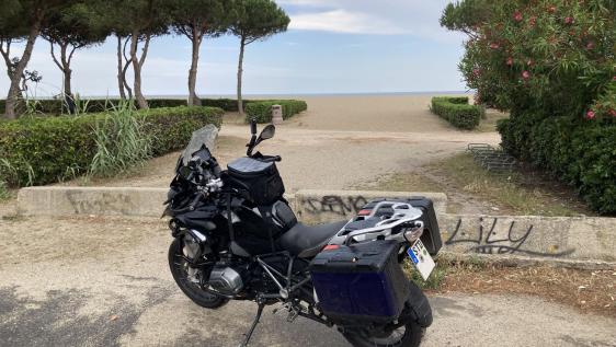 Das Wetter hatte sich deutlich verschlechtert, starker Regen und teilweise auch Wind begleitete mich auf meinem Weg. Ich erreichte das Mittelmeer in Argelès-sur-Mer und schoss am "Argelès Plage" mein Erinnerungsfoto. Durch Baustellen und einem Gewirr von Einbahnstraßen fand ich dann noch den Yachthafen "Port d"Argelès", warf einen Blick auf die Boote und das Meer und machte mich auf den Rückweg.