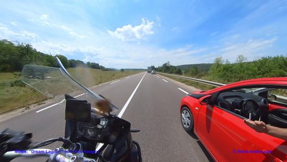 Unterwegs traf ich auf einen Autofahrer, der seine Kippe immer fleißig aus dem Fenster hielt. Ich hatte wieder mal Angst vor der Glut im Gesicht oder auf meiner Textilkleidung. Also fuhr ich neben ihn, um zu signalisieren das er das lassen solle, doch er verstand mich nicht und bot mit stattdessen einen Zug von seiner Zigarette an.