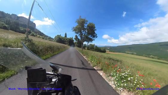 An den Straßenrändern fand ich immer wieder blühende Streifen vor. Die Wiesen und Felder waren reichlich mit blühendem Mohn durchsetzt. Teilweise war ein Teppich aus grün und rot ausgebreitet. Diese Streckenabschnitte habe ich sehr genossen. Ich habe solche Blütenpracht an deutschen Straßen nur selten gesehen.