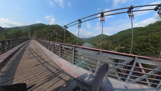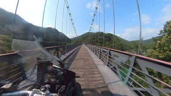 Am spektakulärsten war die Fahrt über diese alte Hängebrücke. Sie lag zwar nicht auf meiner direkten Strecke, doch ich bin einfach abgebogen und hin- und her darübergefahren. Die Holzbohlen klapperten unter den Rädern, ich fand, es war ein kleines Abenteuer, insbesondere für jemanden mit Höhenangst, der auch schon auf die Mühle geklettert war.