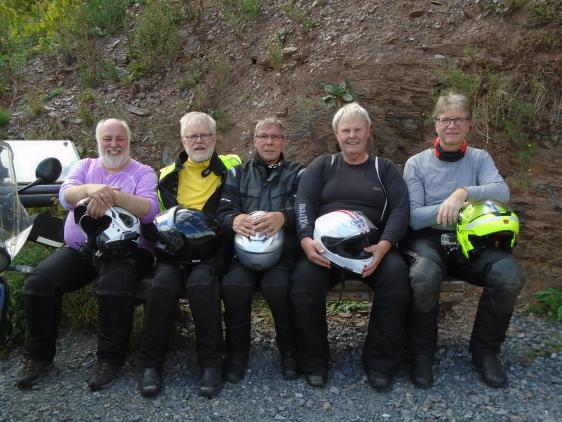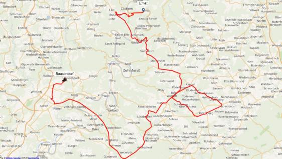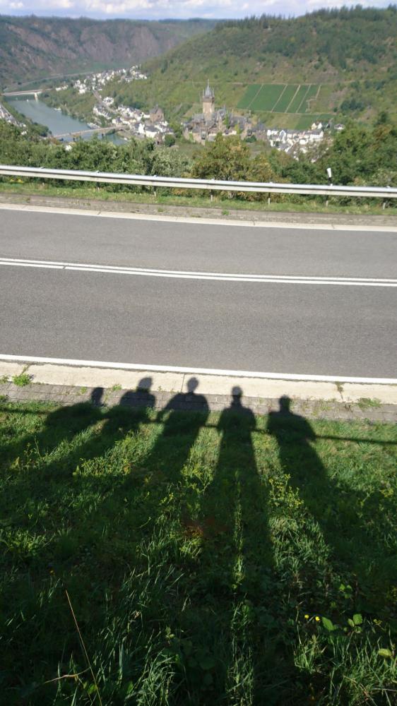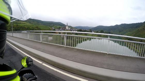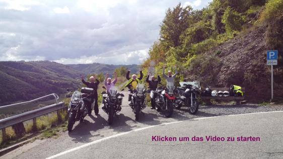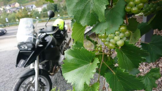 Unser Lieblingspausenplatz ist in der Kehre an der Straße zwischen Valwig und Valwigerberg. Obwohl die Bank genau in der Kurve steht kann man auf dem Feldweg die Mopeds parken und dort die Seele baumeln lassen. Die Augen saugen derweil die Weinberge, die Mosel und die kleinen Orte im Tal auf. Die Villa Andrè ist auch sehr gut zu erkennen. Wenn wir das dritte Mal hierherfahren, versuchen wir das erste Bier durch taktische Zeichen von hier zu bestellen. :-) |