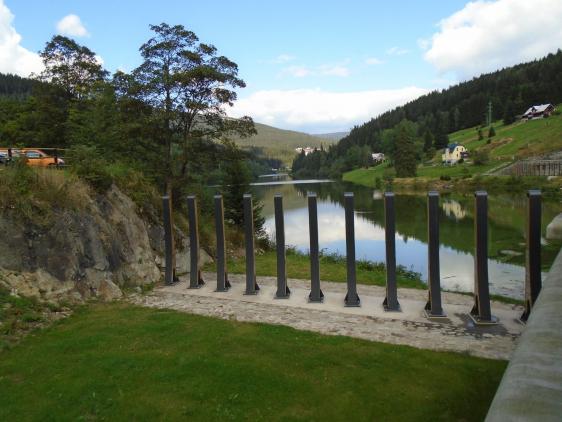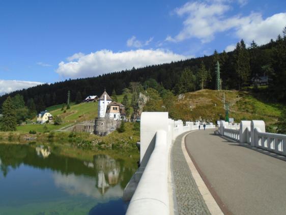 Bernd E. und Willi sind zur "Spindler Mühle" vorgefahren und ich dann hinterher. Auf dem Weg dorthin befindet sich die erste Staustufe der Elbe und man kann die Schneekoppe sehen. |